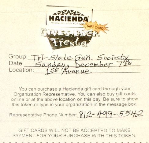 Sunday, December 7, is our Hacienda Gives Back Event! This is such an easy way for you to support your local genealogy society. Here’s all you have to do, go to Hacienda Restaurant, 711 N. First Avenue, Evansville, anytime on Sunday, and eat or get takeout or buy gift cards. When you pay, show this little token or mention Tri-State Genealogical Society and they will donate 20% of the bill to TSGS. Remember, this is only good on Sunday, December 7, and only at the Hacienda on First Avenue in Evansville. This is very near Willard Library. You might even be able to work in some family research while you’re in the area?